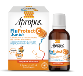 Apropos FluProtect C Junior è un integratore a base di Vitamina C e Zinco, con estratti di Propoli, Echinacea e Rosa Canina.