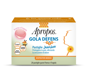 Grazie al Complesso Barriera APM composto da “Attivi Polimerici Mucoadesivi”, Apropos gola defens pro junior panna fragola è un dispositivo medico che crea un effetto barriera che protegge la gola, dall’attacco di agenti esterni dannosi; mantenendola idratata, alleviando la sensazione di dolore grazie alla presenza di Propoli M.E.D.®, legata agli stati irritativi della gola, tipici delle faringiti e delle tonsilliti.