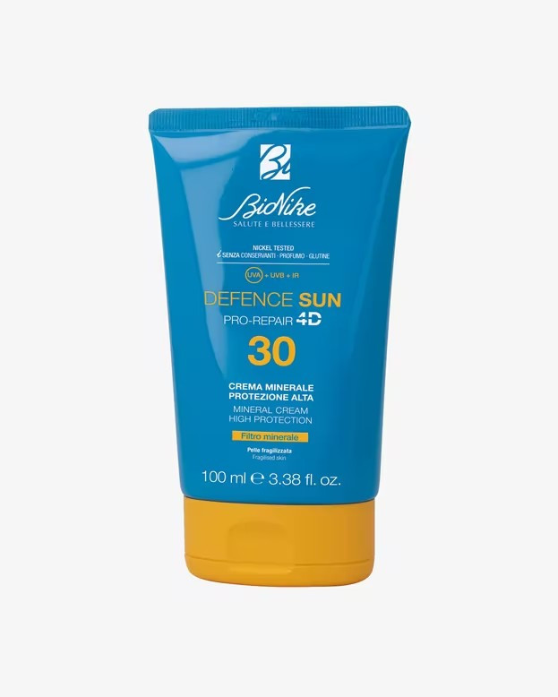 Crema solare viso e corpo Bionike Defence sun 30 crema minerale, formulata esclusivamente con filtro minerale specifico per la pelle fragilizzata.