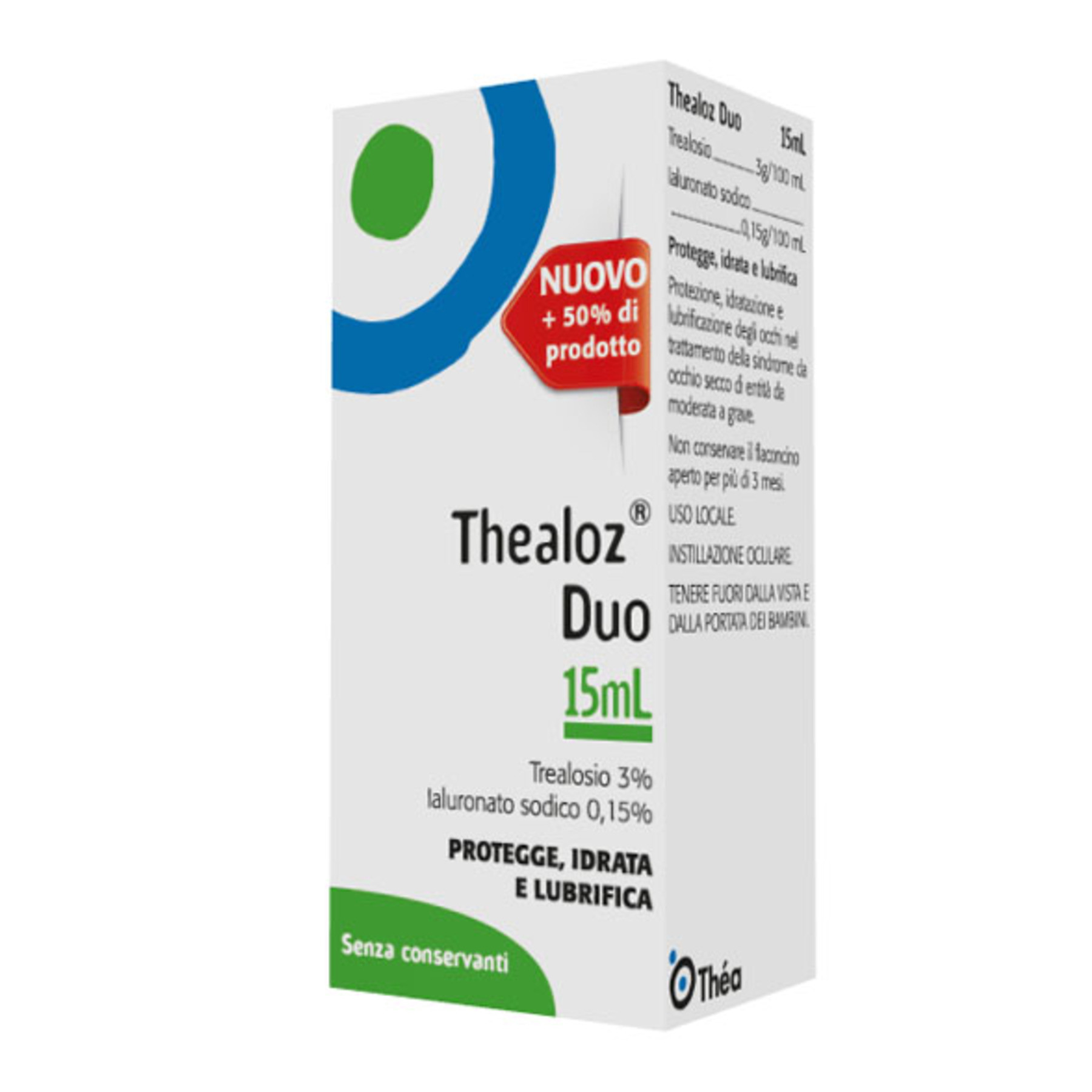 Thealoz Duo contiene una soluzione da somministrare mediante instillazione nell'occhio o su lenti a contatto. Thealoz Duo è raccomandato in caso di fastidio, bruciore o irritazione degli occhi. Tali sintomi possono essere causati da fattori esterni come per esempio vento, fumo, inquinamento, polvere, esposizione al sole o al freddo, caldo secco, aria condizionata, viaggi in aereo, lavoro protratto di fronte allo schermo del computer, ecc.